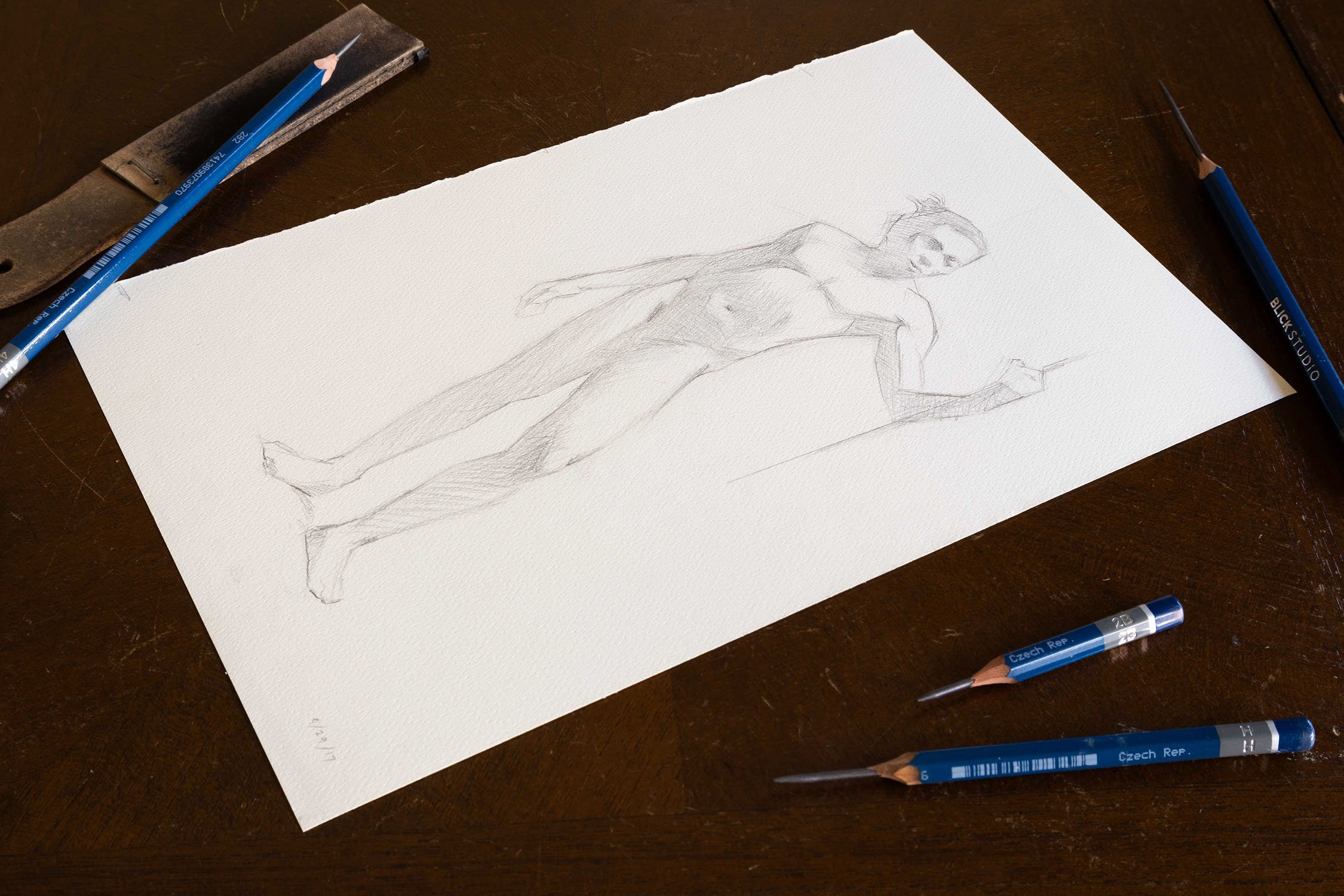A pencil figure drawing. Every Tuesday evening at my atelier we would eat pizza and then draw from the live model after our normal classes. The focus was on creating a beautiful light and atmospheric shadows. The mantra, ‘Light is Form and Shadow is Atmosphere’, was key here.